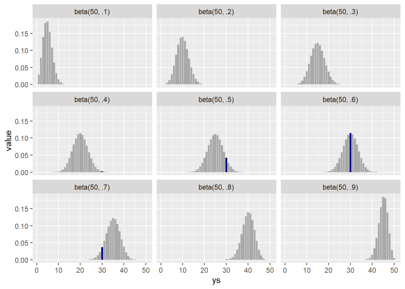 `beta(50, .3)` = dbinom(x = ys, size = 50, prob = .3),
